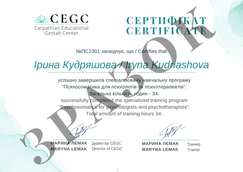 - Модуль 2. Симптом як «застигле» творче пристосування. Експерименти в роботі з психосоматичними розладами. Психосоматичний симптом і контакт із світом. Дослідження зупинених емоцій у формуванні симптому. Самопідтримка терапевта.
