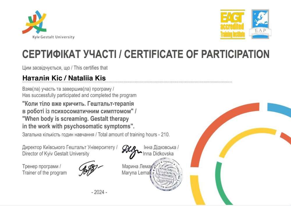"Коли тіло уже кричить. Гештальт-терапія в роботі із психосоматичним симптомом". КГУ - 2024 р.