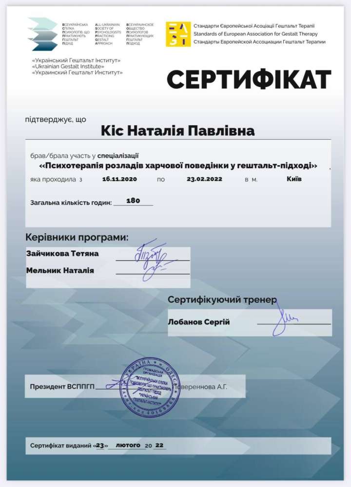 "Психотерапія розладів харчової поведінки. Гештальт підхід". ВСППГП - 2022 р.